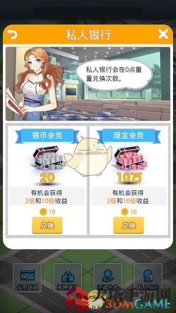 除了信用贷款和抵押贷款,如果玩家急需大量银币和现金,银行系统还提供了私人银行业务。只需用10金币就能兑换20银币或10万G币,遇到紧急情况时,可以根据需求随时兑换。而且,运气好的话,兑换时还有可能触发暴击——那就是有机会获得2倍或10倍的兑换收益!这样的设计无疑让游戏更加有趣。
