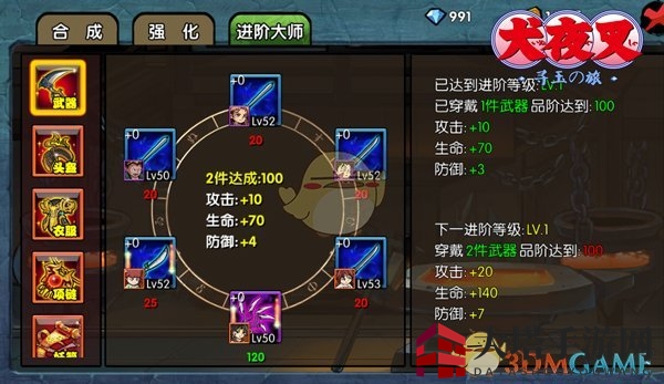 1、装备:装备一般都有强化功能,游戏中强化步骤被大大简化,只需一个按键即可让所有装备强化到最大值。在收集方面,玩家获得大量装备时,可选择出售或熔炼5种同阶等装备合成高一阶等装备。