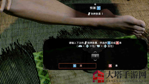 赌场唯一的玩法是猜单双,玩家可在单与双之间下注,最低1驹牌,最高1000驹牌。