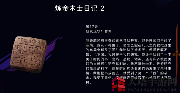 先在外面发现的便是炼金术士日记2,此时游戏已进展至第17天,这位炼金术师似乎迷路了,看起来有些可怜。