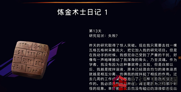 来到房间中部平台,会发现一个废弃的石堆,点击后即可获得炼金术士日记1。
