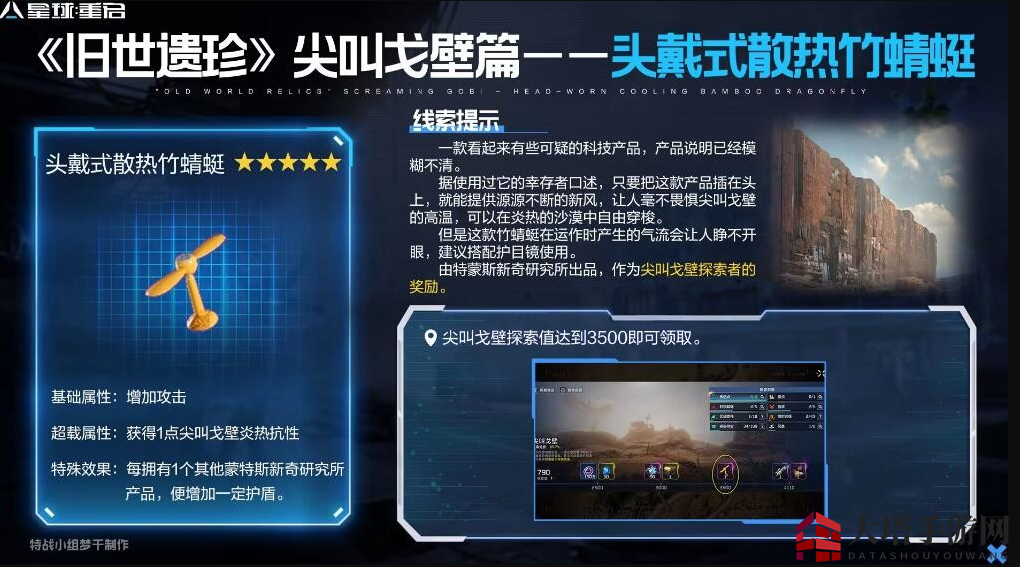 要得到头戴式散热竹蜻蜓,你需要的是在尖叫戈壁的探险中累积3500点的探索值。