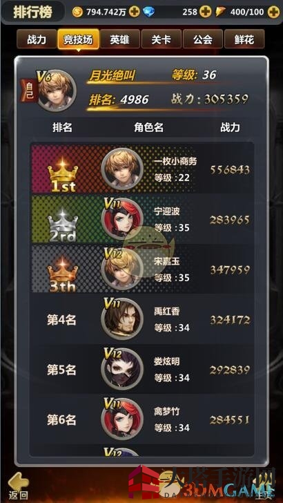 点击“排名之巅”,快速查看您的竞技场排名,以及其他角色的实力和等级信息。