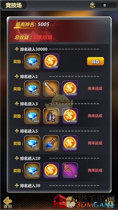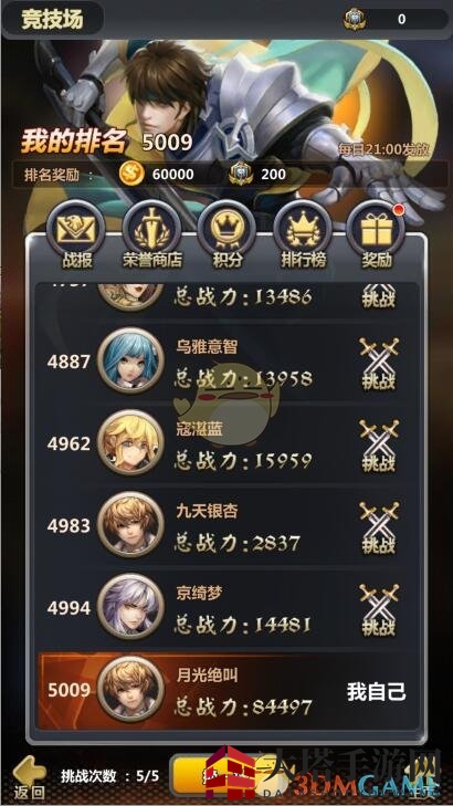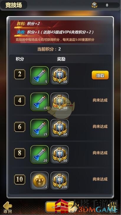 “积分榜”每天凌晨5:00刷新,胜利一场得2积分,失败一场得1积分。VIP6级以上,失败也能得6积分。积分越高,奖励越丰厚,包括荣誉值、装备精炼材料、天赋点等。