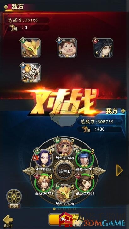 点击挑战按钮后,进入准备界面,您可以看到对手的阵容,并调整自己的阵容以应对。