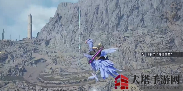 3、前往任务地点捕捉陆行鸟,沿着右侧斜坡前行,捡起地上的蔬菜,引诱蓝色陆行鸟进入草丛捕捉。