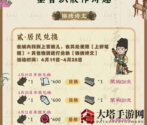 5、兑换锦绣诗文:在城内找到上官婉儿,用上好笔砚及其他物资,即可兑换锦绣诗文。