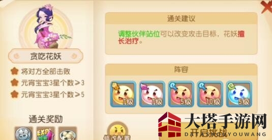 1、第八关Boss——嘴馋花妖特点:擅长治疗,三星通关必备5个3星级宝宝。
