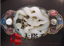 明代镶玉嵌宝冠,半球形设计,金片叠加,底纹为吉祥的四合壬字云纹,冠面镶嵌红、白、蓝、绿等宝石约50粒,冠顶如意形嵌宝簪,两侧嵌宝笄,尽显繁丽高贵。明代云南沐氏家族传承之宝,现为云南省博物馆藏品。