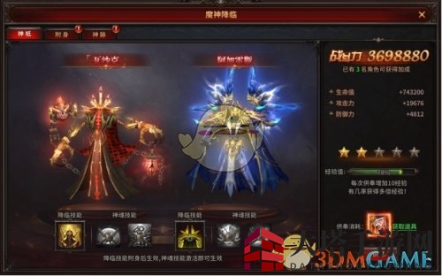 (2)消耗神魂觉醒卷轴,唤醒魔神神魂,获得属性增强及强力战斗技巧,强化降临效能。