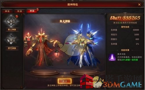 (4)激活特定数量的魔神神祇,开启魔神神脉,获得神脉属性和神脉技能。