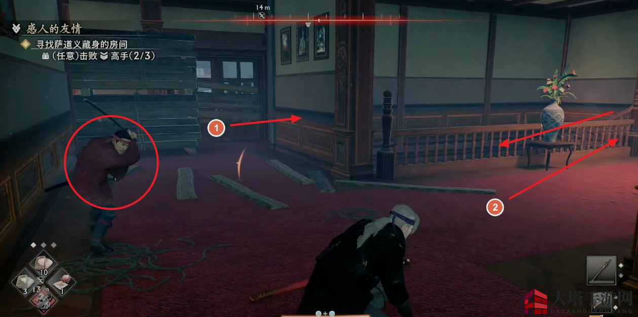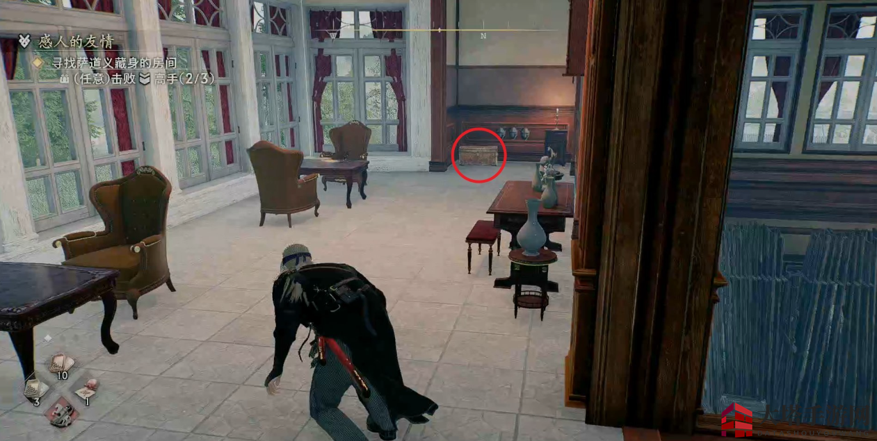 先走到敌人后面将其暗杀,注意敌人的身后有一个陷阱。