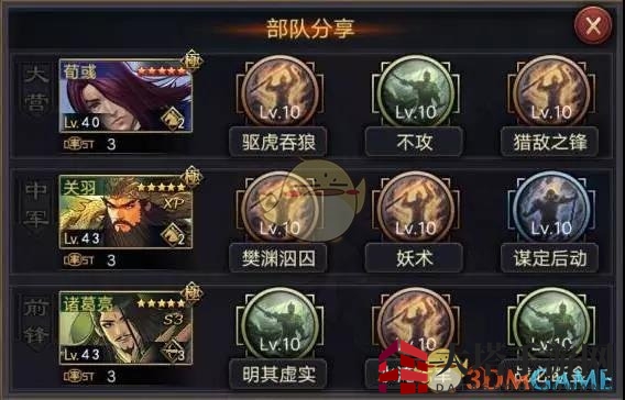 考虑到武将因素,最终选定荀彧作为核心输出,充当大营位置;关羽由输出向半输出半辅助的控场型中军转变;弓诸葛拥有超高的智力成长,作为纯辅助实在太过浪费,因此由他佩戴一个能发挥其智力特性的战法很有必要,考虑到队伍输出较弱,最终选择佩戴【水淹七军】来达到补足输出的效果。